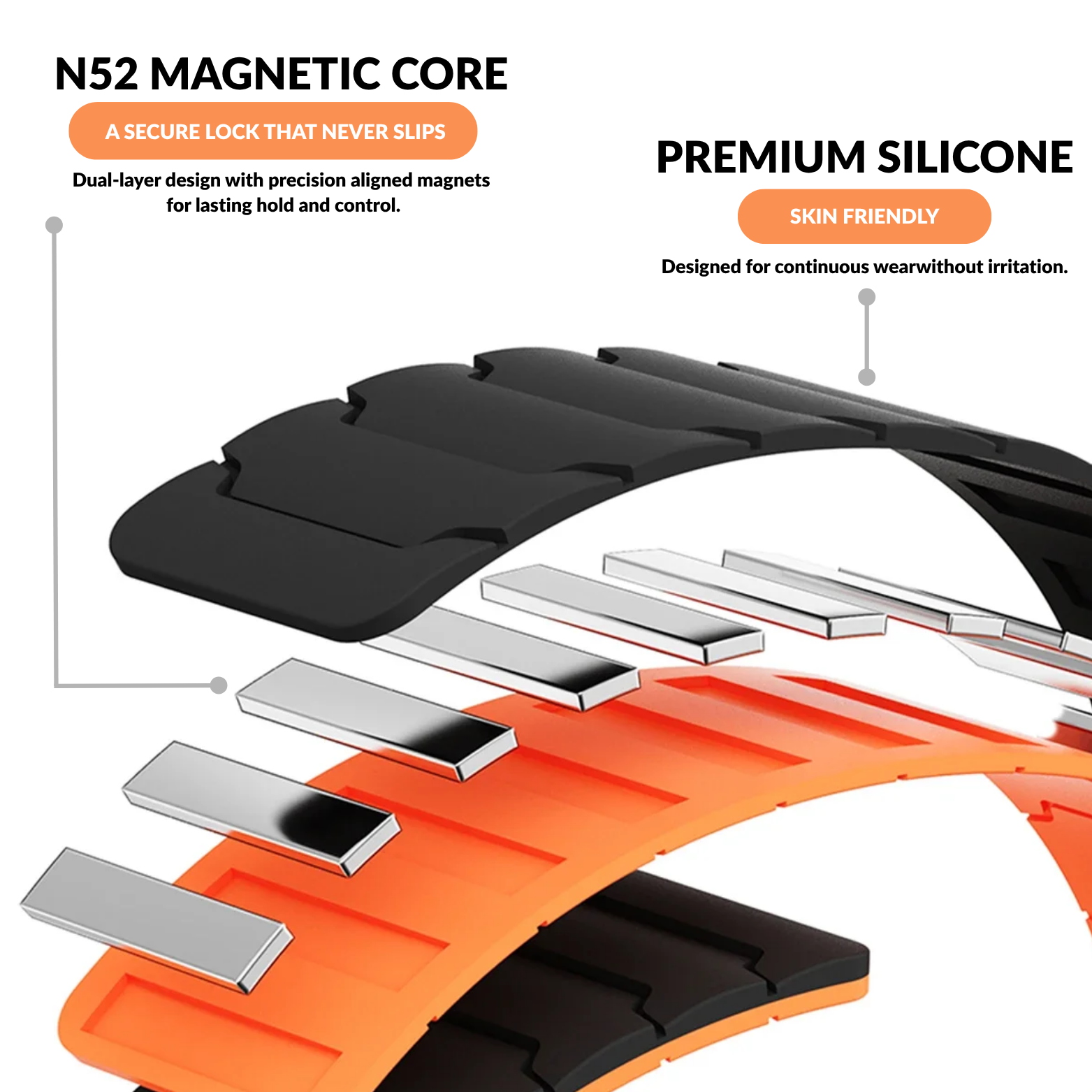 The dual-magnetic core locks with confidence, while the soft, sweat-proof silicone moves naturally with your wrist. Durable, waterproof, and refined — this is strength you can feel, and comfort you can trust.